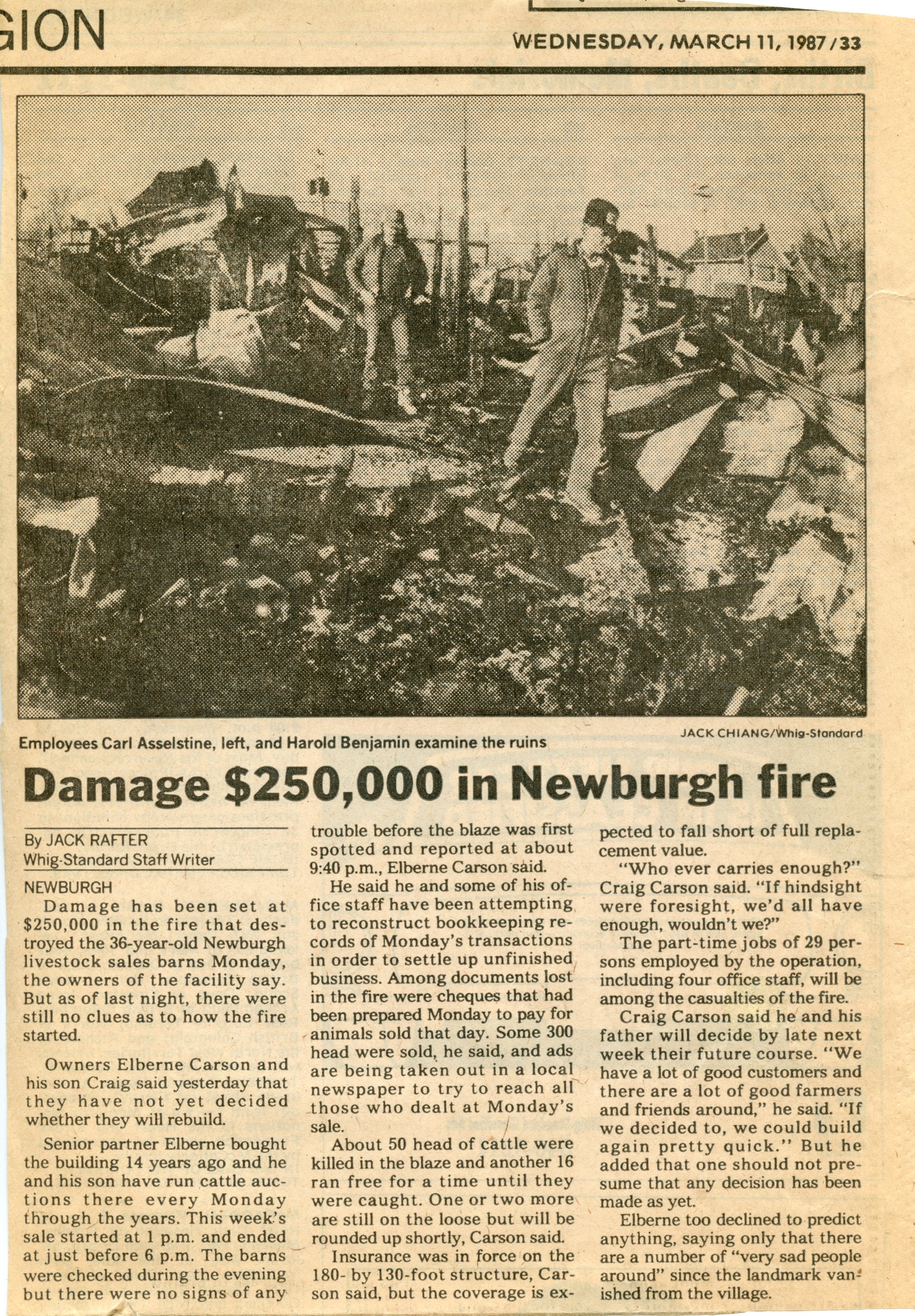 Fire broke out in the evening of Wednesday March 11th, 1987 at the large sales barn located in the center of Newburgh on Main Street, (now Market Square). By morning, the large wooden building was completely destroyed. About 50 head of cattle were killed in the fire and another 16 escaped into the streets of Newburgh.
