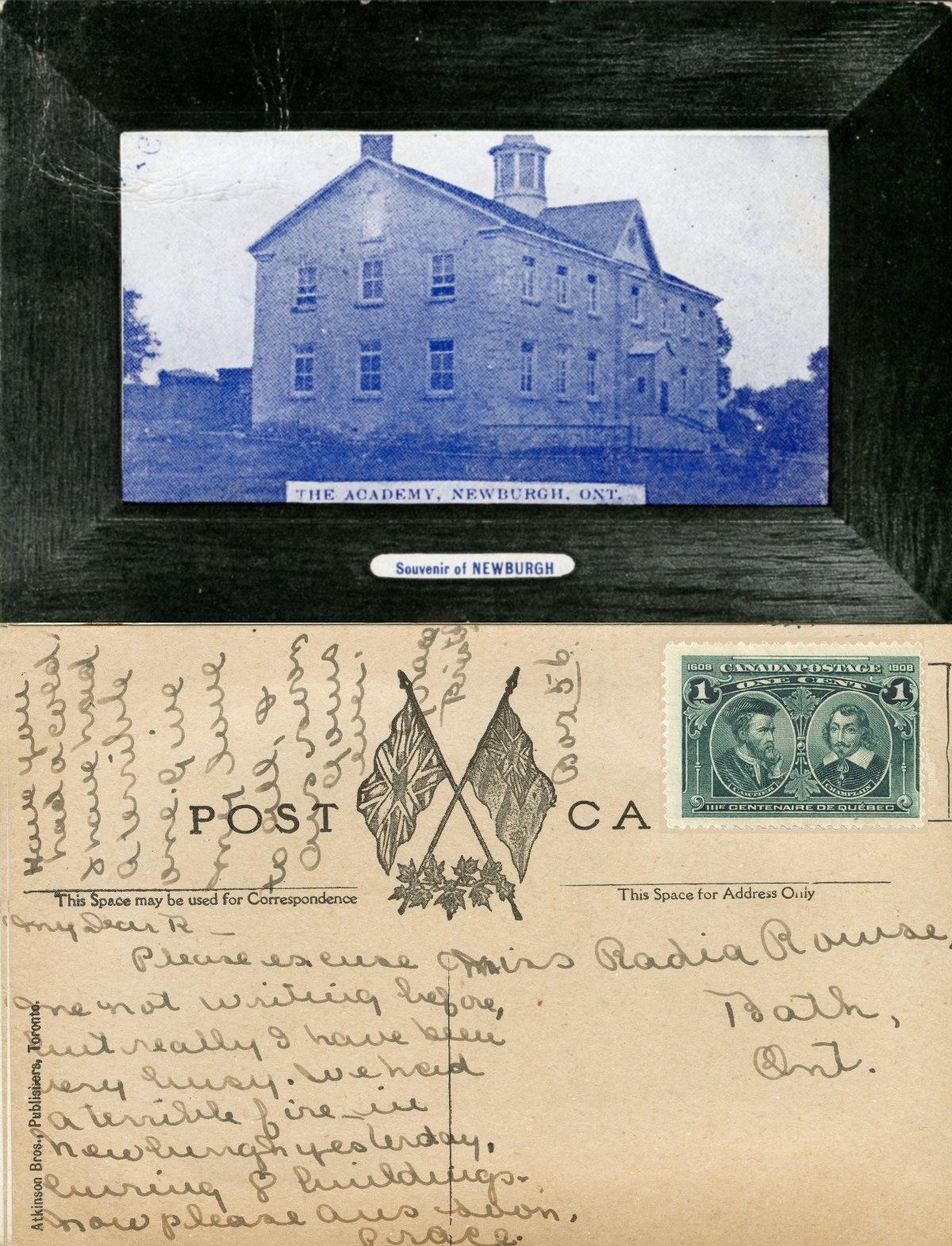 The postcard is to Radia Rowse, 4 yrs old, from Grace Bristol, 16 yrs old, (using the census records). Grace was attending the Academy to become a teacher. She is listed in the 1911 census as a teacher in Ernestown Township.